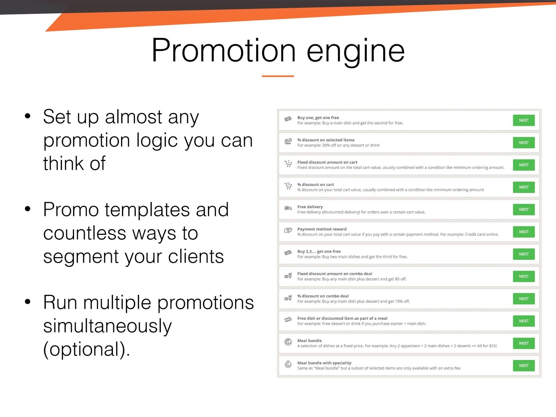 Our online restaurant promotions engine for online ordering includes a built-in restaurant promotion module so you can create incentives for new or returning customers.